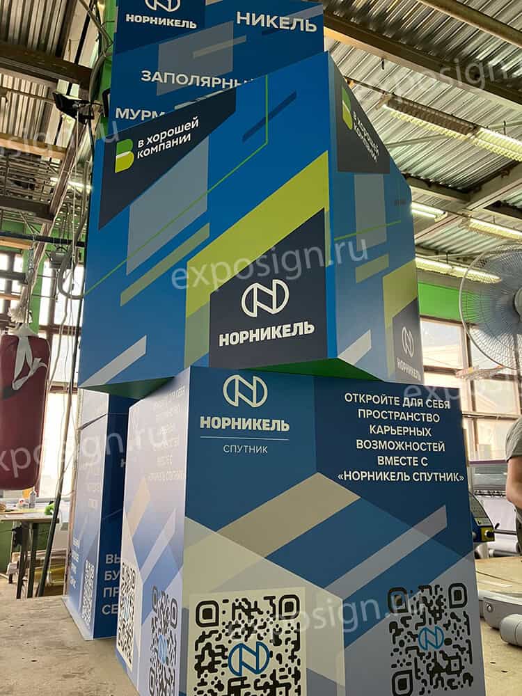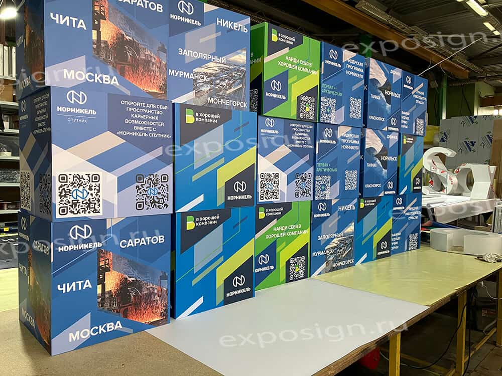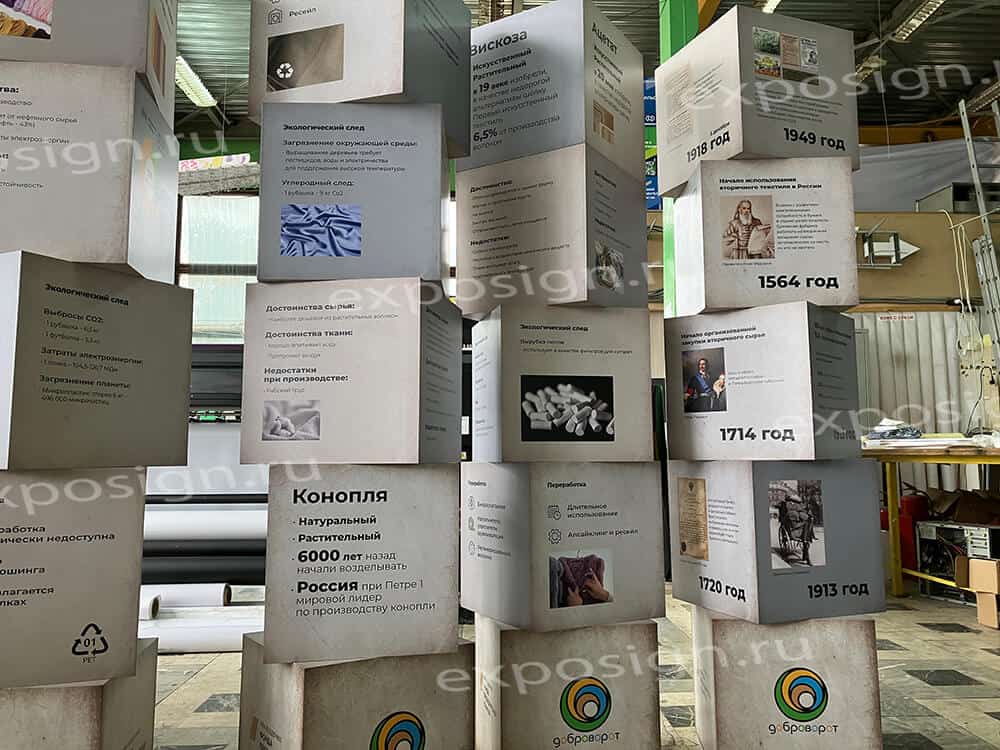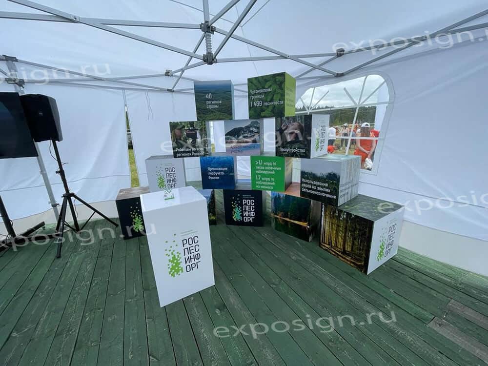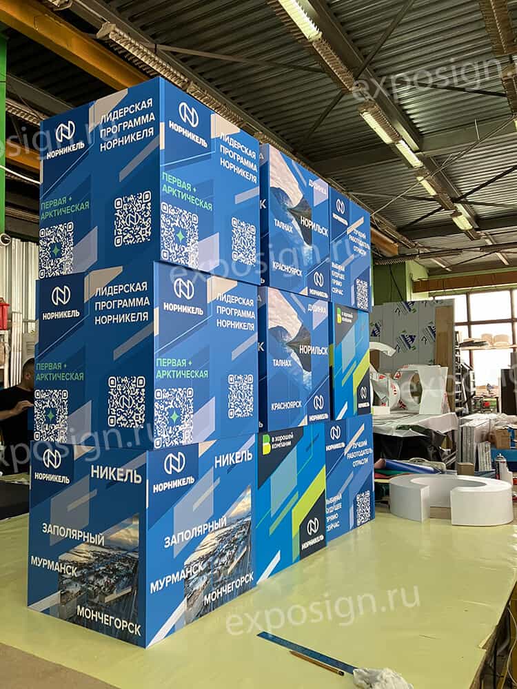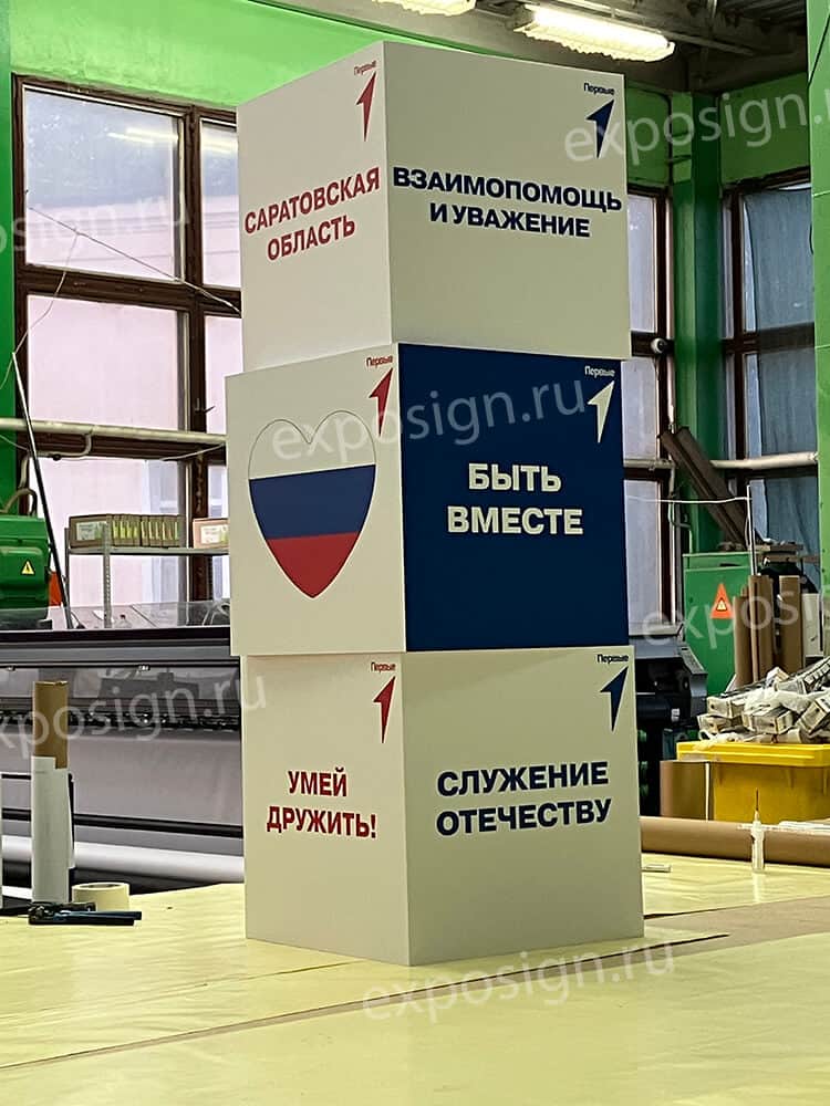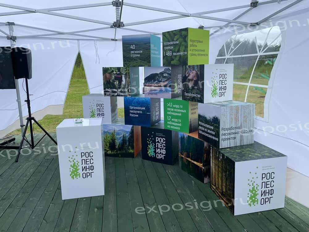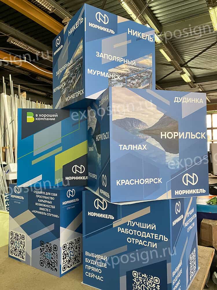 При проведении рекламных и развлекательных мероприятий часто используют объемные фигуры. В подобных случаях актуальной становится композиция из кубов с печатью. На поверхности объемной фигуры может быть нанесено любое изображение.