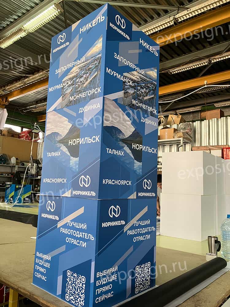 Куб в виде подставки – подиума может обладать зеркальными поверхностями. Для изготовления таких фигур часто применяется баннерная основа.
