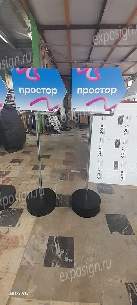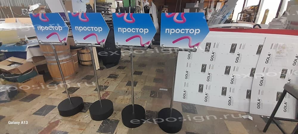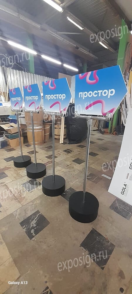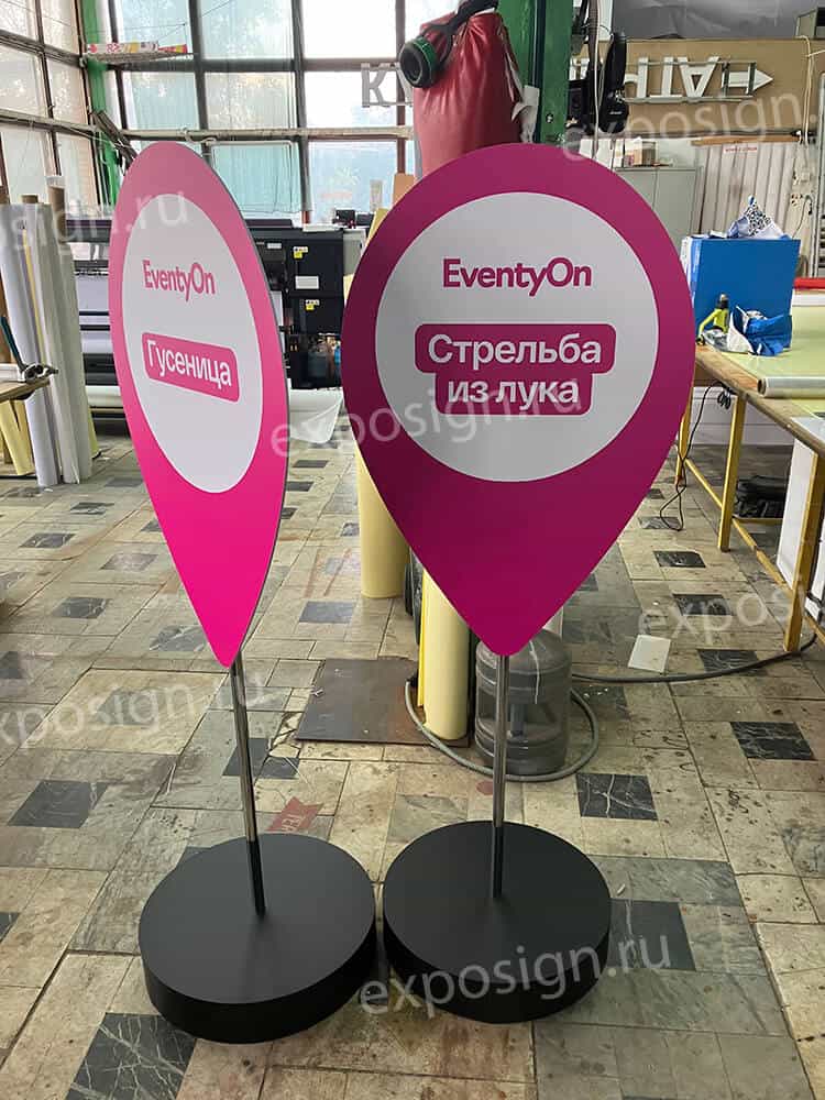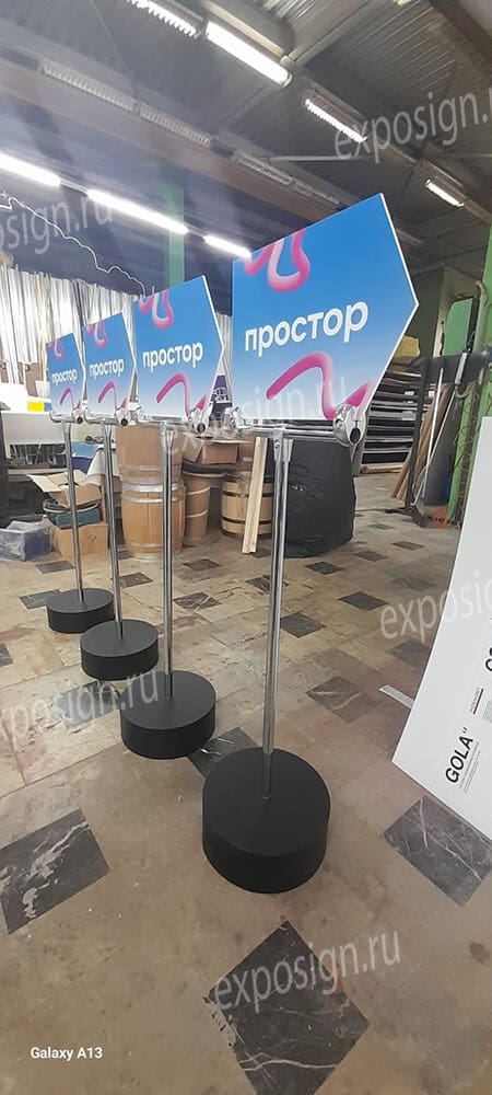 Сотрудники РПК «Экспосайн», где вы будете заказывать такой продукт, обязательно помогут подобрать стиль указателя под мероприятие и под саму компанию и подскажут, как грамотно и удобно их разместить.