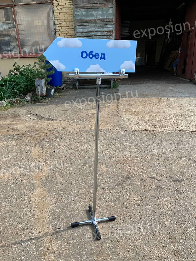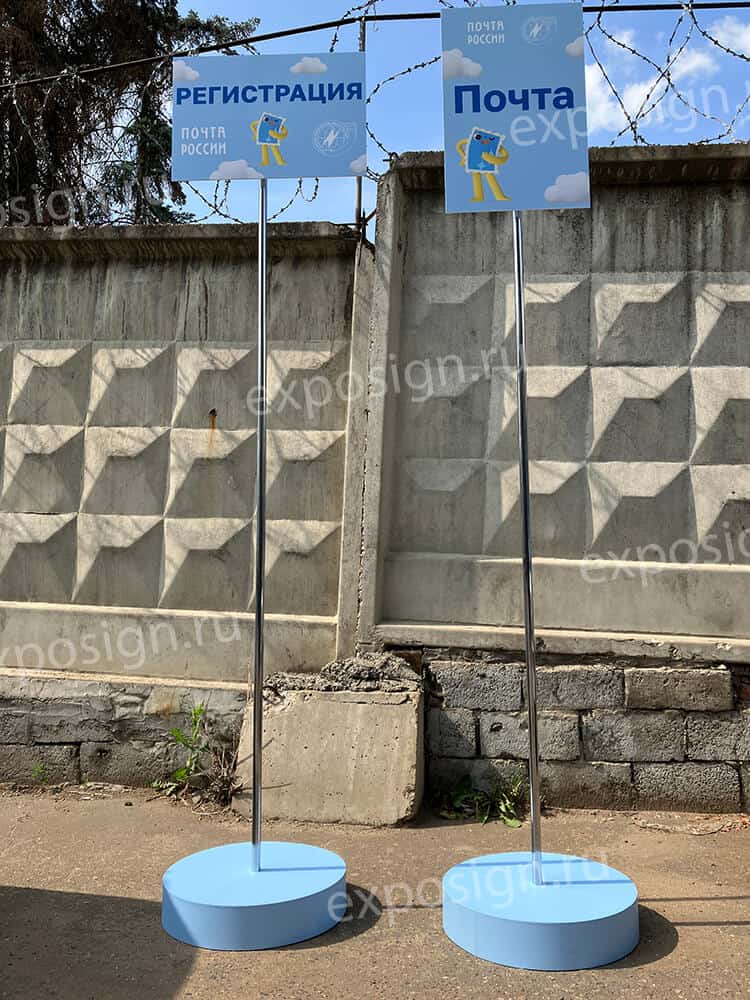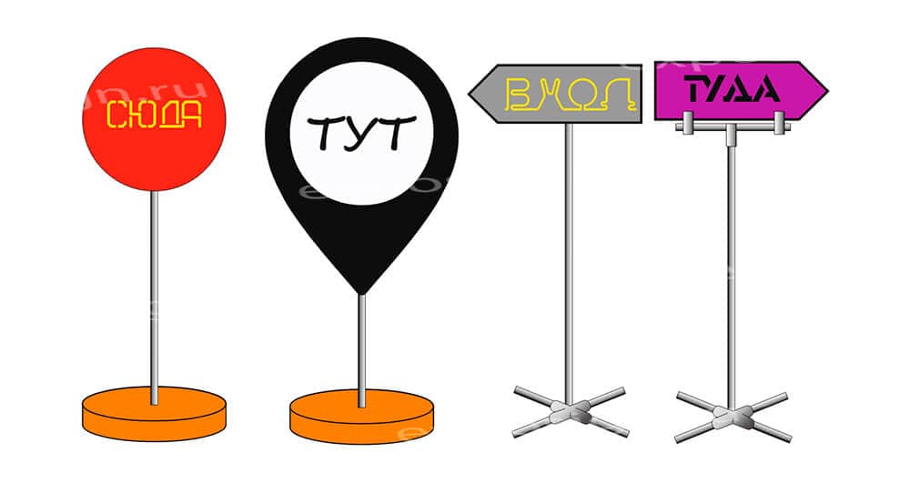 В данном качестве могут быть использованы указатели на ножке, которые можно с легкостью переносить с места на место, меняя дислокацию, что удобно, если вы решили немного изменить запланированное расположение всех точек. Обычно такие указатели используют в сочетании с табличками указателями на мероприятии, которые дополняют друг друга.